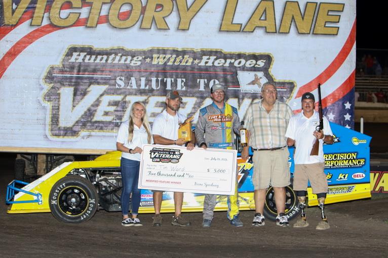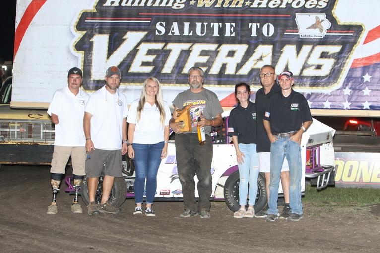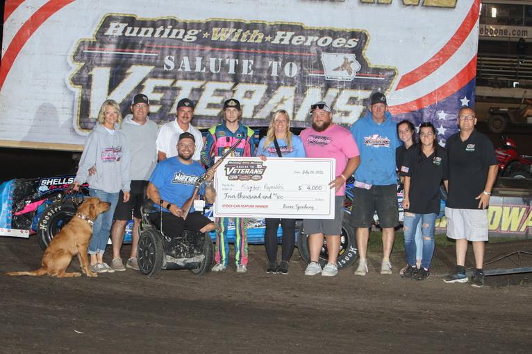 It was a night filled with patriotism and thanking our Veterans at the Boone Speedway on Saturday when Boone held its Annual Hunting with Heroes Salute to Veterans Night sponsored by EMW Trucking, and Waltert Farms. A whopping 241 race cars came to try their hand at Iowa's Action track. Prior to the racing, Veterans enjoyed a free meal, drink, gifts, and free admission to the races. Specially wrapped Salute to Veterans race cars were on display behind the grandstand, and a stirring pre-race ceremony was also held.