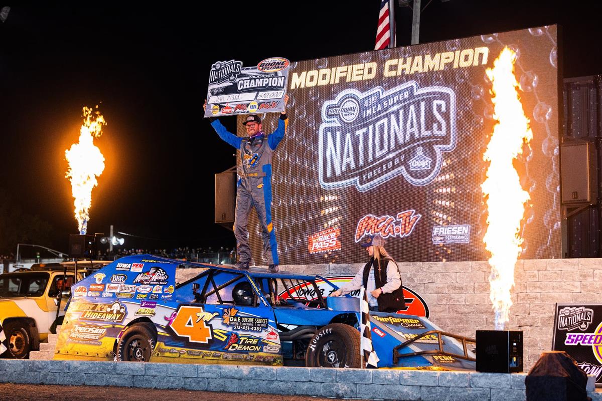 HARCOURT, Iowa. (09/08/25) – For the second time in three years, Tim Ward stood atop the podium at Boone Speedway, capturing the crown in the 43rd annual Speedway Motors IMCA Super Nationals fueled by Casey’s.